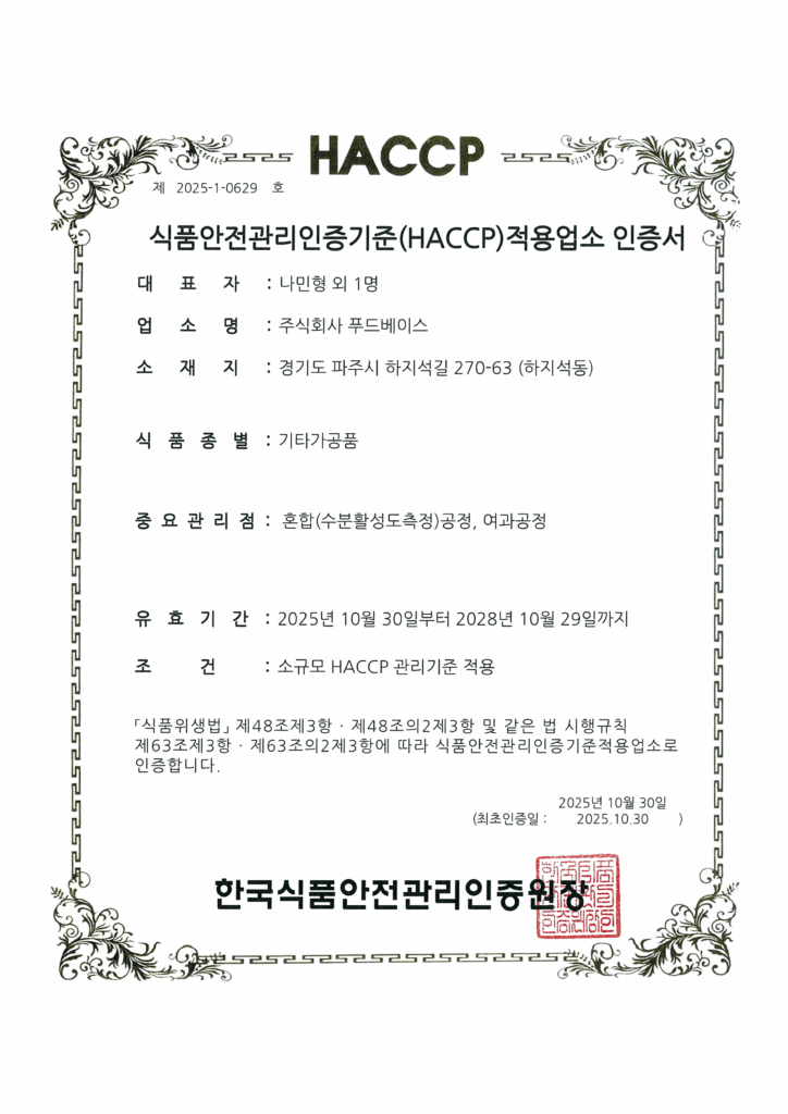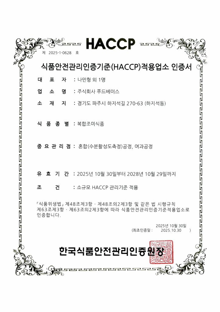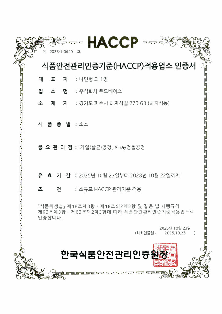 healthy & safetyfood culture leaderCERTIFICATION STATUS HACCPCERTIFICATION STATUS식품의약품안전처 위해요소중점관리기준 인증현황 소스최초인증일 2025. 10. 23. 기타가공품최초인증일 2025. 10. 30. 복합조미식품최초인증일 2025. 10. 30.
